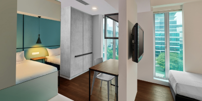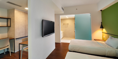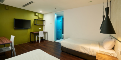 • 带连接浴室 • 房间内禁止烹饪! • U Residence 一层的公用厨房 • 每间客房免费使用空调180小时(可充值) • 每间客房的人数:1 • 预订押金:RM2,500 • 每人每月租金:RM2,160 03 套房双床间